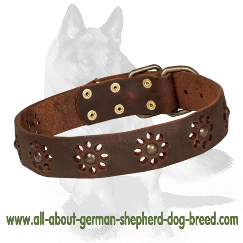 Feel lack of spring mood? Order this floral leather dog collar for your German Shepherd and you will be pleased with your pet's fine look. This decorative leather accessory has unique design, it is covered with punched flowers. Due to such pattern, the gear and dog in it look very refined and attractive. The collar is strong and reliable for daily training. It suits for fashionable walking as well. Wearing this magnificent leather collar, your German Shepherd will be much more elegant and inimitable. Take care of your doggie and buy him this floral leather collar!